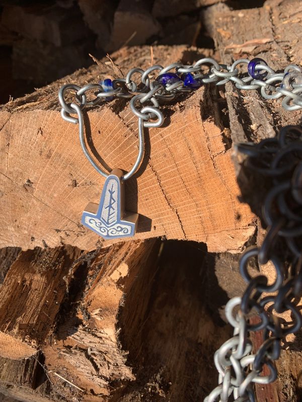 First ever forged in fire and sand casted aluminum mjolnir on a 14g steel chain with hand blown glass beads. This was the first true test of tattooing aluminum detailing so it has human error. truly a beautiful piece that will outlast its owner and be able to hand down for generations